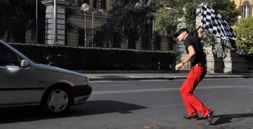 Un uomo ‘inaspettato’ informa i guidatori che percorrono una strada circa il fatto di essere arrivati al traguardo di una gara inesistente... dopo essere stata realizzata in varie città d'Europa, dal 2006 ad oggi, la performance 'Traguardo' è stata realizzata da Germondari per la prima volta a Roma, di fronte alla sede dell’Ospizio Giovani Artisti.