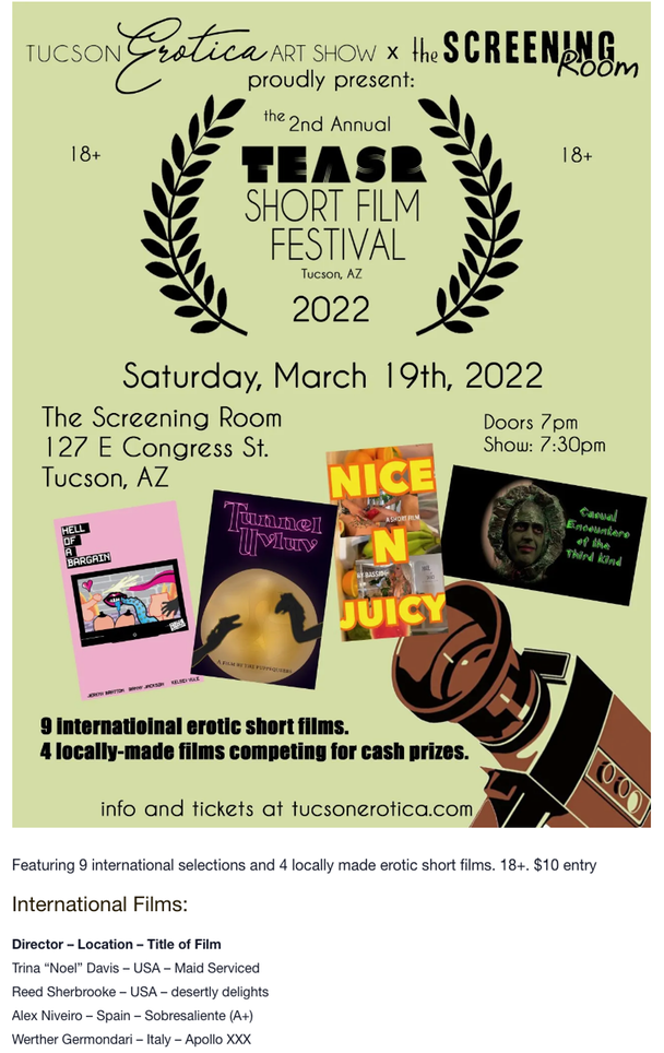 Screenings: Tucson Erotica Art Show, USA, March 2022; PostPorn Film Festival, Warsaw, Poland, June 2022.
