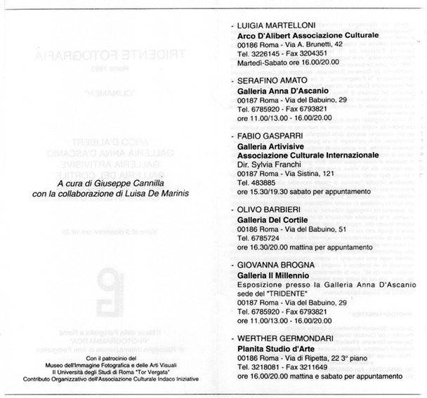 "Reality and its signs are faced by Werther Germondari with a double attitude: on the one hand they are reabsorbed in an apparent uniformity of the visual field (as in certain historical experiences conducted by '' analytical '' photography in the seventies), in which the 'full', as we already said, turns upside down in a web of empty signs, which only denounce their framework. In this structure, however, the tight accumulation of details leads to entering it and identifying paths of meaning, even if no common thread can be taken as privileged. On the other hand, on the other hand, the image highlights the impact of some strong signs, often underlined to the point of inducing the doubt that they were purposely built as in a performance (an aspect, this, moreover, present in other works by Germondari) . Their presence behaves like a false key that does not open any door, even when the artist provocatively provides us with the indication of a meticulously targeted observation point (like the binoculars shown in this exhibition), which does not provide any interpretation, but invites us to go further, to take other steps”. (Giuseppe Cannilla, text in ’Tridente Fotografia, Roma, Italy, 1993)